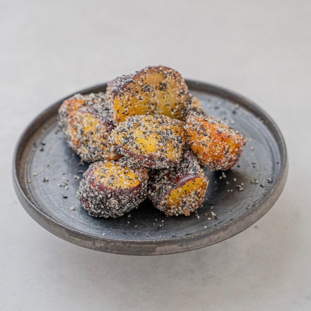 【内 容】 ※計15パック 黒ごま100g ×15p 【いろんな味が楽しめる大学芋】 カリッとほくっと ひと口かじれば さつまいもの風味が口いっぱいにひろがります 大学芋に きなこ?抹茶?ありそうでなかった新感覚の芋菓子です! 【食感や味わいの変化を楽しめるのが特徴】 ◆15分~30分解凍 ひんやりカリカリ食感 お芋の風味とすっきりとした品のある甘さを感じます ◆30分~60分解凍 飴が溶けはじめ、しっとり食感 パウダーが浸透して濃厚な味わいに変化します ※季節・室温によって多少異なります ★お好みの食感と味わいをお楽しみいただけます。 【こだわり】 ◎プレーン 定番のプレーン、外はカリッと飴でコーティング さつまいもは上品な甘さで繊維の少ない口当たり滑らかなシルクスイートを使用しています。 ◎きなこ 数種類のきなこを混ぜ合わせ、噛めば噛むほど鼻に抜ける香りと旨みが増すよう追求しました。 リピート購入率No,1 ◎黒ごま ごまを弱火でじっくり炒ることでこうばしい香りと食感を引き出しています。やみつきになります。 ◎抹茶うぐいす 抹茶だけだと苦くてとても食べられないので青大豆をいって粉にしたうぐいす粉を抹茶の風味が引き立つ絶妙なバランスで調合しました 甘いものがあまり得意じゃない方にも喜んでいただけます。 【美味しく召し上がっていただくために】 解凍時間が長いと飴が溶け落ちます。カリカリ食感がお好みの場合はお早めにお召し上がり下さい。 【賞味期限】 発送日から90日以上 解凍後は冷蔵保存にて当日中にお召し上がり下さい。 【発送までの目安】 ご注文後、3〜5営業日中に発送します通常、商品の発送から1~4日でお手元に届きます。 【原材料】 プレーン:さつまいも(国産)、砂糖、食用なたね油 きなこ:さつまいも(国産)、砂糖、きなこ、食用なたね油、(一部に大豆を含む) 黒ごま:さつまいも(国産)、砂糖、ごま、食用なたね油、(一部にごまを含む) 抹茶うぐいす:さつまいも(国産)、砂糖、青きな粉、抹茶、食用なたね油、(一部に大豆を含む)